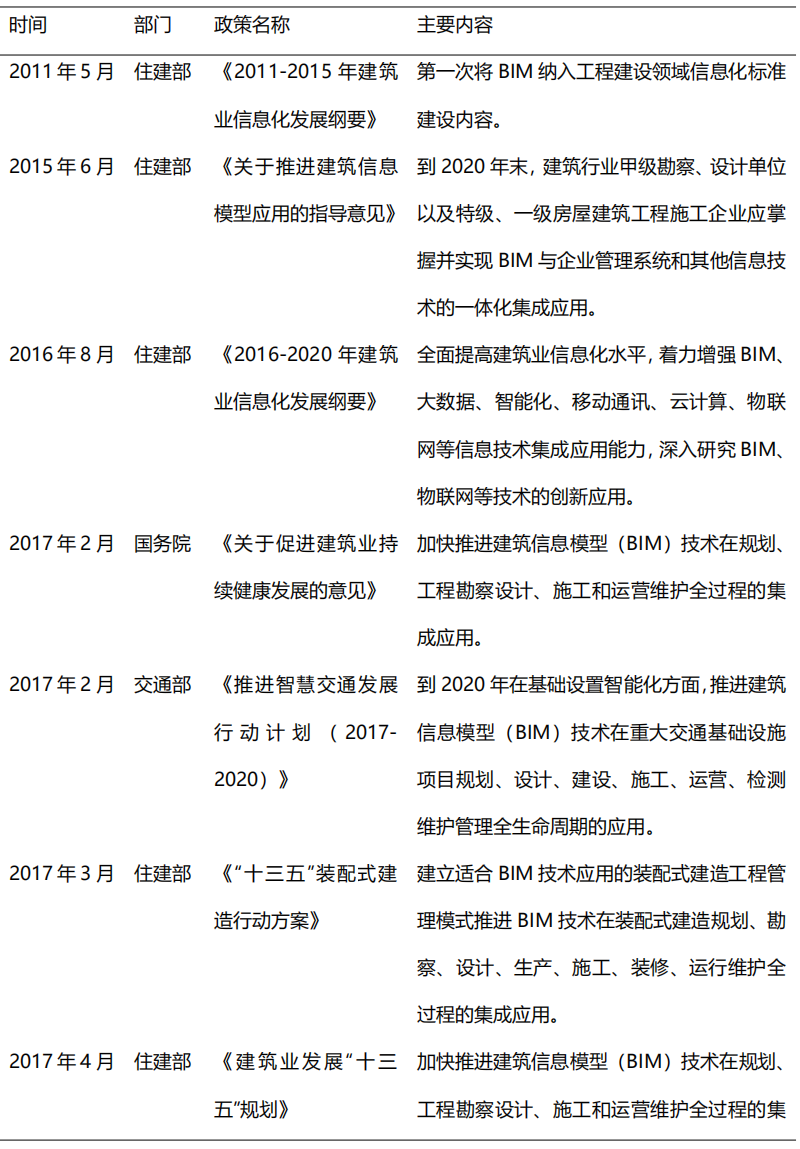 隨著社會的發(fā)展,行業(yè)需求的轉變,加之國家和各地政府的扶持,建筑行業(yè)信息化、數據化、智能化趨勢不可逆轉。BIM勢必全面應用到規(guī)劃、勘察、設計、施工和運營維護中來,實現(xiàn)工程建設項目全生命周期數據共享和信息化管理。近年來,國務院、住建部等相關單位,頻繁頒發(fā)鼓勵和要求應用BIM技術的指導意見,表1列出了國家層面的重要文件。