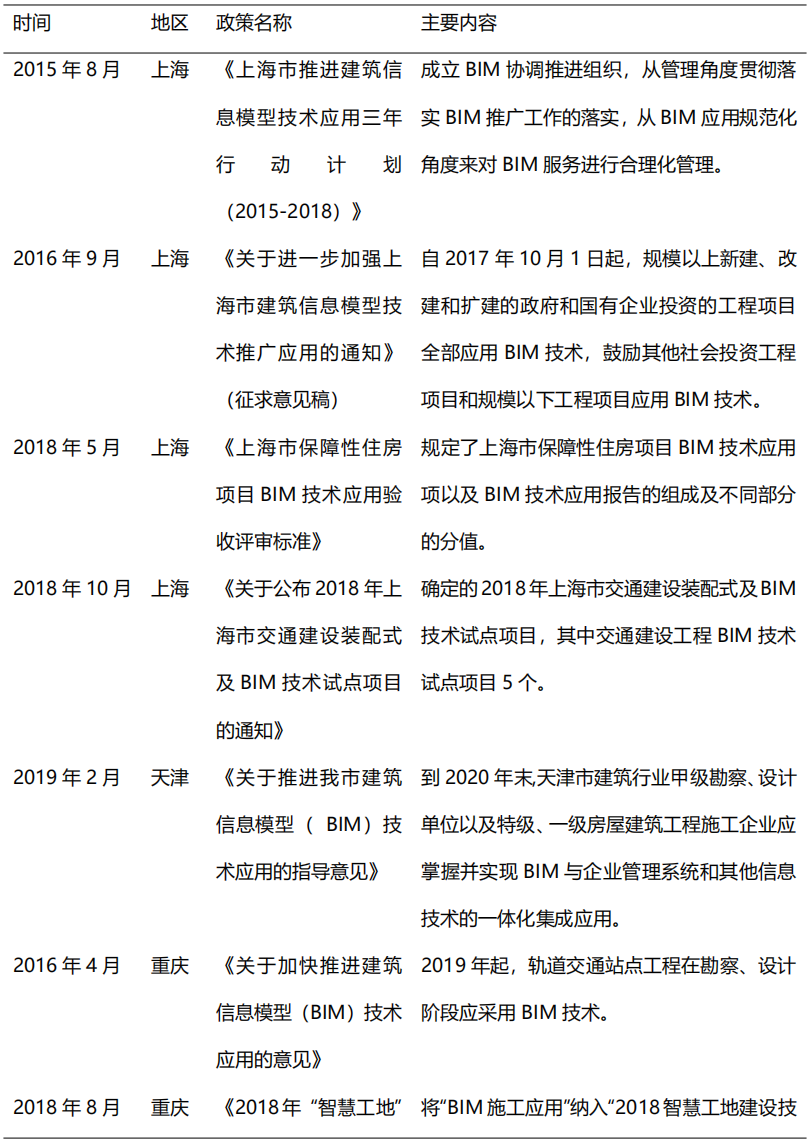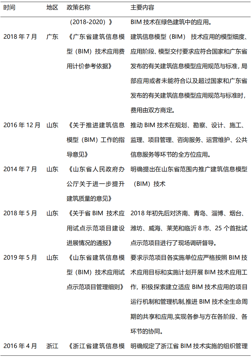 從2014年開始,在住建部的大力推動下,各省市政策相繼出臺BIM推廣應用文件,到目前我國已初步形成BIM技術應用標準和政策體系,為BIM的快速發(fā)展奠定了堅實的基礎。2017年,貴州、江西、河南等省市正式出臺BIM推廣意見,明確提出在省級范圍內提出推廣BIM技術應用。2018-2019年,各地政府對于BIM技術的重視程度不減,重慶、北京、吉林、深圳等多地政策出臺指導意見,旨在推動BIM技術進一步應用普及。隨著我國出臺BIM推廣意見的省市數量逐漸增多,全國BIM技術應用推廣的范圍更加廣泛。表2列舉了部分重要地方鼓勵政策。