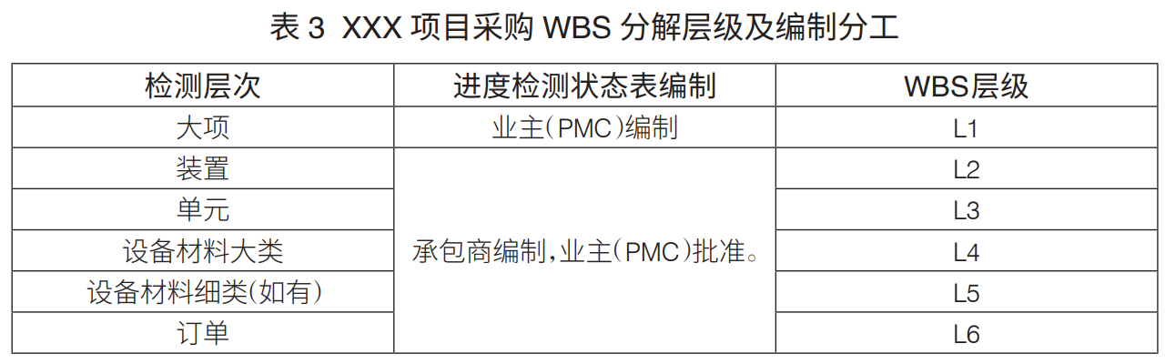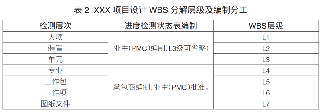 工程項(xiàng)目WBS分解層級:工程項(xiàng)目WBS分解主要是進(jìn)行設(shè)計、采購、施工WBS分解。通常,設(shè)計WBS分解至七級、采購WBS分解至六級、施工WBS分解至六級,可滿足工程管理要求(表1)。
