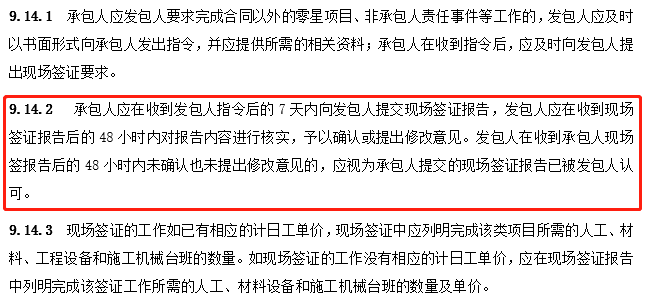 此外,第9.14.2條中,“......發(fā)包人在收到承包人現(xiàn)場(chǎng)簽報(bào)告后的48小時(shí)內(nèi)未確認(rèn)也未提出修改意見(jiàn)的,應(yīng)視為承包人提交的現(xiàn)場(chǎng)簽證報(bào)告已被發(fā)包人認(rèn)可。”即,從時(shí)限來(lái)講,“48小時(shí)”亦非能夠滿足發(fā)包方充分詢價(jià)并與承包方定價(jià)的時(shí)長(zhǎng)。