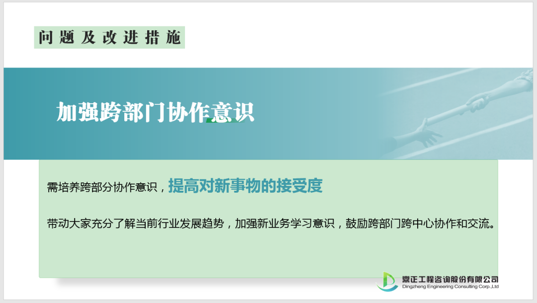 1、工程咨詢事業部:持續保持積極向上的態度,從人才儲備、資質資信、技術沉淀、經驗積累等方面做了大量工作,為部門“十四五”發展做了充足的準備。