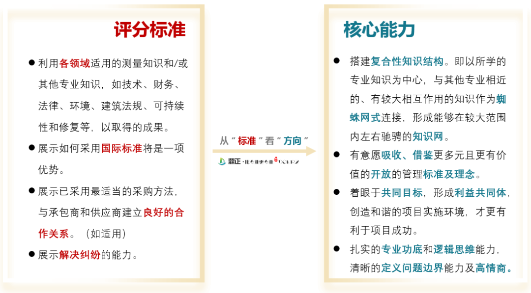 通過此次評獎申報過程中的思考與體會,我們想從RICS中國獎評分標準談談項目經理的努力方向。無論是投資決策咨詢、規劃設計,還是政府采購與招標代理、工程造價咨詢、工程監理及項目管理咨詢的項目經理,都需要明確?優秀的項目管理是什么樣的?要實現這些成果需要培養并精進哪些核心能力?