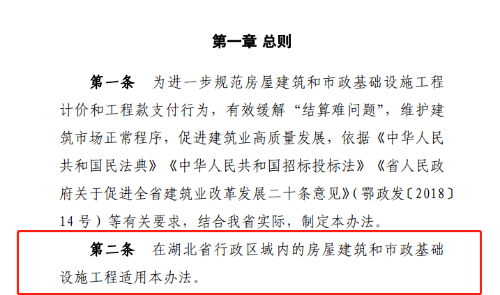 自本辦法實施之日起,湖北省內的房屋建筑和市政基礎設施工程適用本辦法,不區分資金性質。施工工程是否必須適用本《暫行辦法》,則需結合項目進展情況而定:已進行招投標或已簽訂合同的工程,仍按原約定執行,已發包暫未確定中標單位的,招標人可發布澄清公告對結算方式進行變更,也可以按原約定繼續進行。