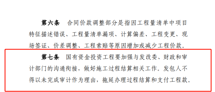推行過程結算,建設單位應滿足施工所需的資金安排,工程驗收通過時原則上應同步完成工程款結算,不得變相拖延結算。國有資金投資工程應當按照國家有關規定確保資金按時支付到位,不得以未完成審計作為延期工程款結算的理由。在以往的建設工程司法案例中,合同雙方若在合同中約定以行政審計后的價款作為結算價款的,法院予以支持。眾所周知,行政審計一般在項目驗收完成之后進行,那么在推行施工過程結算的背景下,發包人在招標文件及合同條款中再約定以行政審計后的價款作為結算依據的,明顯與過程結算的推行意義相違背。