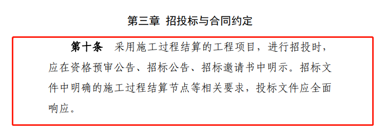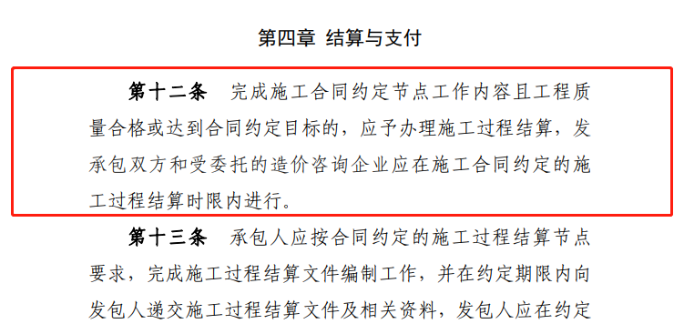本條定義何為施工過程結算,相較住建部2021年發布的《建筑工程施工發包與承包計價管理辦法》(修訂征求意見稿)第十九條規定“全面推行施工過程結算和支付。發承包雙方通過合同約定,按時間節點或進度節點對周期內已完成且無爭議的工程量進行價款計算、確認,并按照合同約定比例支付。”《暫行辦法》增加了節點驗收,驗收是節點結算與支付的前提。