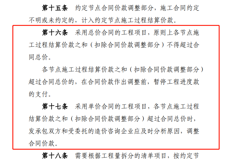 分別對總價合同的建設項目和單價合同的建設項目的施工過程結算的方式和過程進行解釋、說明。總而言之,不管總價合同還是單價合同,施工過程結算價款之和(扣除合同價款調整部分)均不得超過合同總價,否則可能出現工程未完成已支付完成的情況。具體支付比例可根據發包人資金使用計劃在合同中約定,但不得低于當地行政主管部門的相關規定。