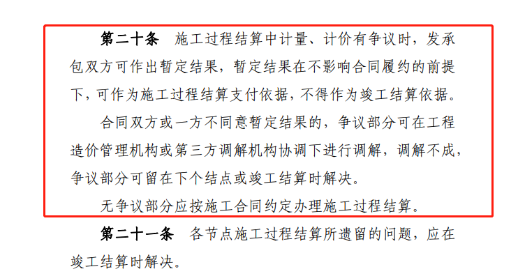 施工過程結算中計量、計價有爭議和無爭議兩種情形。對于有爭議部分,發承包雙方可作出暫定結果,并作為施工過程結算支付依據,但不得作為竣工結算依據,最終竣工結算按照雙方在調解后確定,或者在下個結點或者竣工結算時確定。