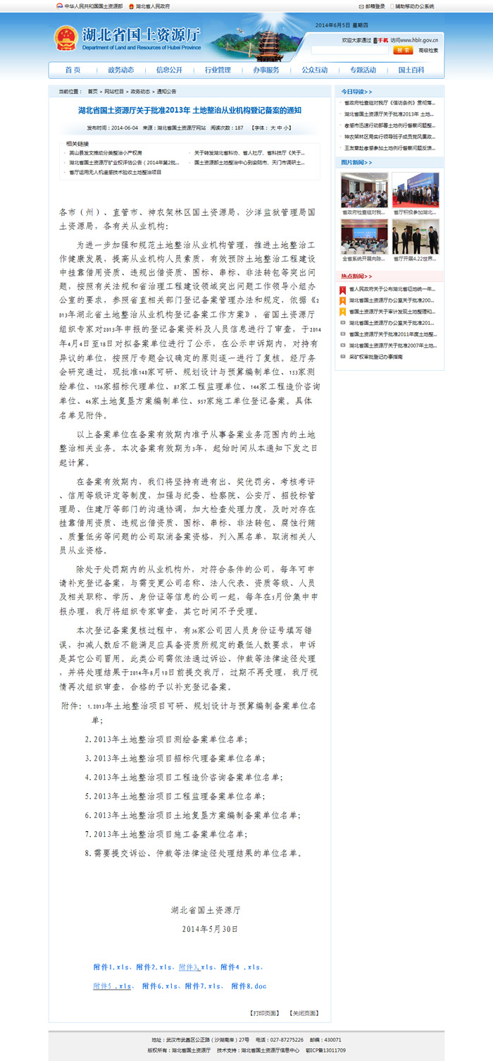 祝賀我司所有相關(guān)業(yè)務(wù)均通過湖北省國土資源廳2013土整從業(yè)機構(gòu)備案