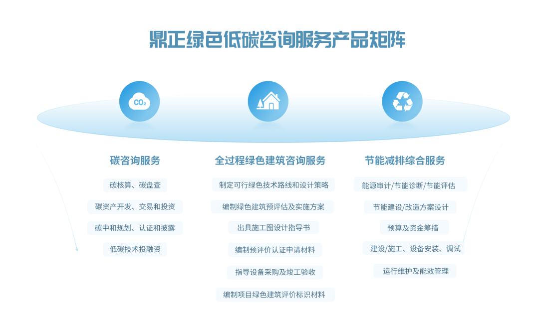 鼎故革新,正己守道。作為一家以創(chuàng)新驅(qū)動變革的工程咨詢企業(yè),我們密切關(guān)注國家前沿動態(tài),緊跟國家政策,不斷優(yōu)化產(chǎn)品結(jié)構(gòu)和服務(wù)模式。在“雙碳”目標(biāo)下,自2020起即針對工程領(lǐng)域的降碳、減排展開探索,協(xié)助政府統(tǒng)籌區(qū)域能源消耗,為碳指標(biāo)交易及資產(chǎn)管理、綠色金融、政策法規(guī)等方面的規(guī)劃作出指導(dǎo),這為孵化綠色低碳咨詢產(chǎn)品矩陣打下堅(jiān)實(shí)的基礎(chǔ)。