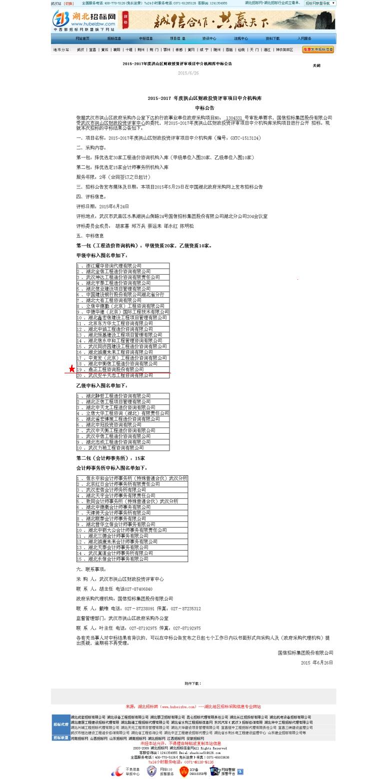 【經營成果】我司入圍2015-2017 年度洪山區財政投資評審項目中介機構庫