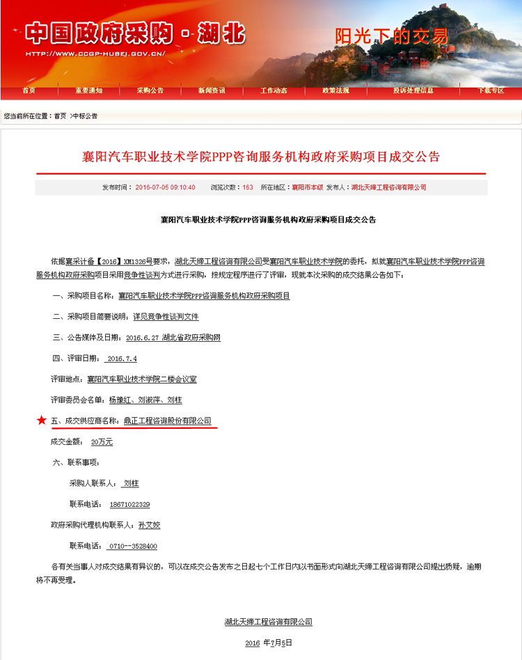 【經營成果】我司中標襄陽汽車職業技術學院PPP咨詢服務機構政府采購項目