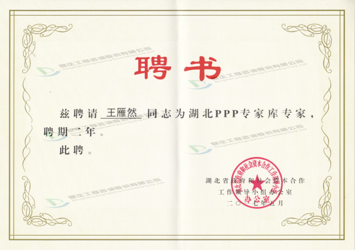 近日,湖北省政府和社會資本合作工作領(lǐng)導(dǎo)小組辦公室授予鼎正公司董事長王雁然先生、副總經(jīng)理兼技術(shù)總監(jiān)朱立冬教授為湖北省PPP專家?guī)鞂<摇4饲?/SPAN>,我司王雁然先生、朱立冬教授、張宏亮先生已入選湖北省財政廳PPP專家?guī)鞂<遥硗猓跹闳幌壬€被崇陽縣人民政府聘為崇陽縣PPP項目專家顧問。