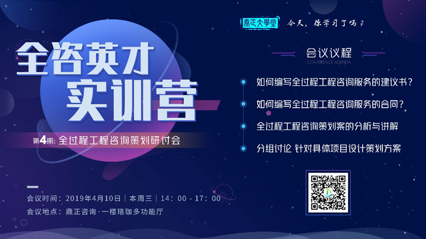 4月10日下午兩點(diǎn),全咨英才實(shí)訓(xùn)營第四期—全過程工程咨詢策劃研討會(huì)在我司一樓珞珈多功能廳隆重開講。